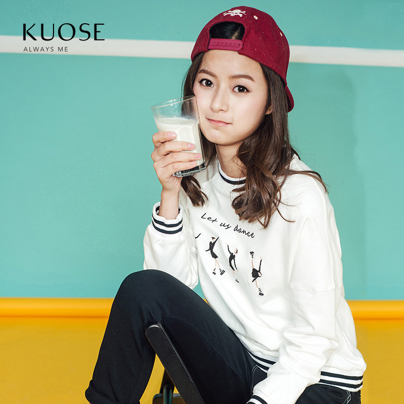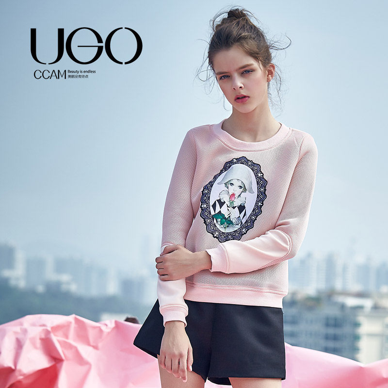 UGOCCAM2016春装新款 薄款空气层太空棉粉色印花套头卫衣长袖女款
